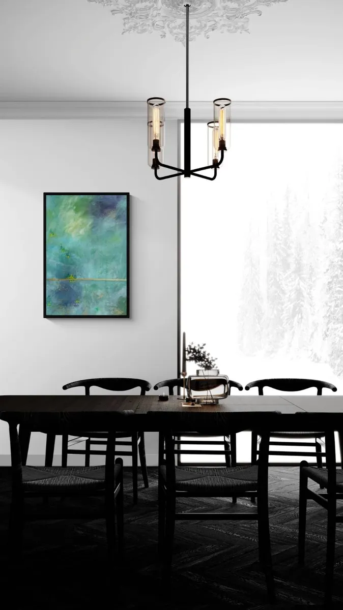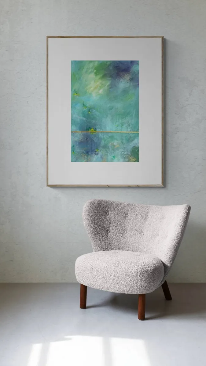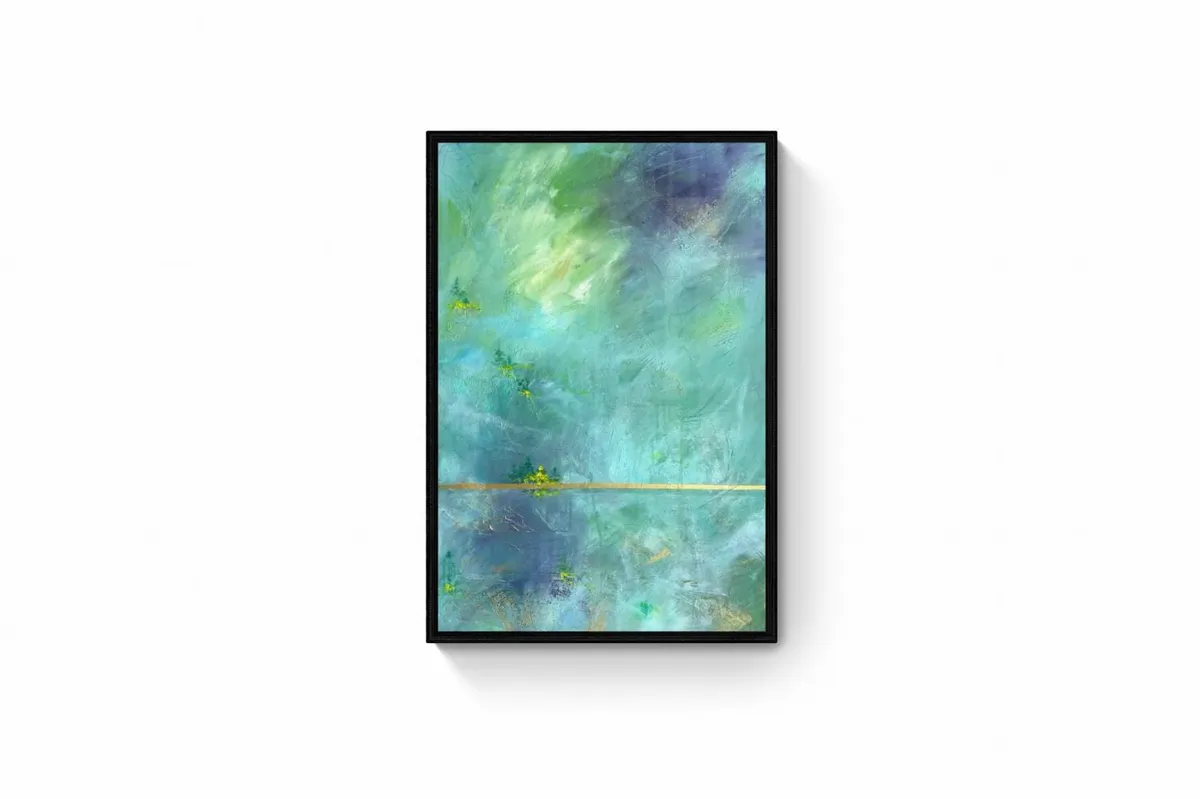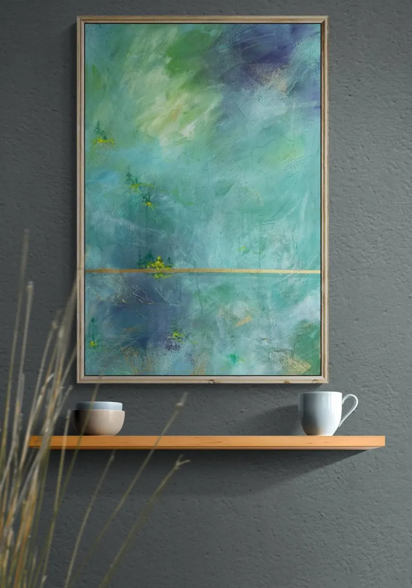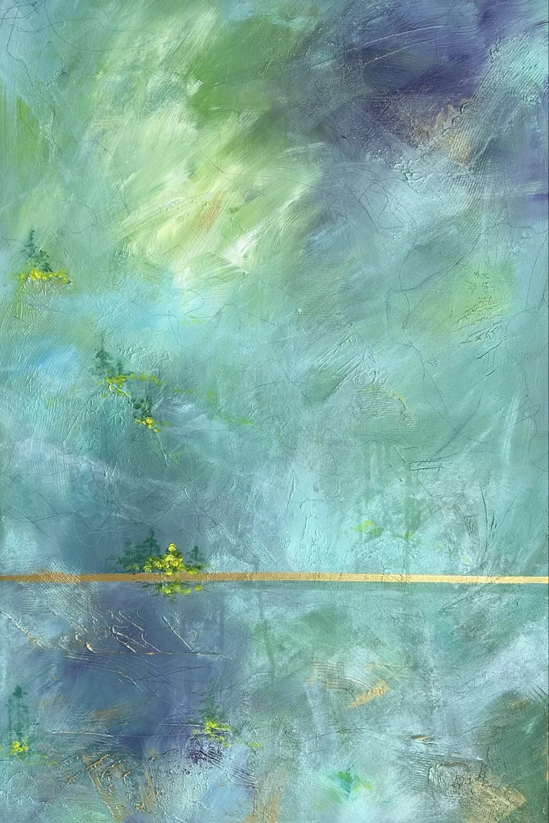 This abstract acrylic painting captures the serene whispers of the mountains through a masterful interplay of colors and forms. The landscape is rendered in ethereal hues of green and blue, evoking the quiet majesty of mountainous terrains. Small patches of dense forest intersperse the rolling hills, depicted in darker shades of green. Scattered throughout are vibrant dots of yellow, symbolizing sunflowers that add a lively contrast to the subdued backdrop. The composition balances tranquility with vibrant life, inviting viewers to listen closely to the subtle, nature-inspired narrative.