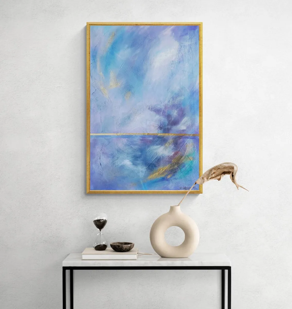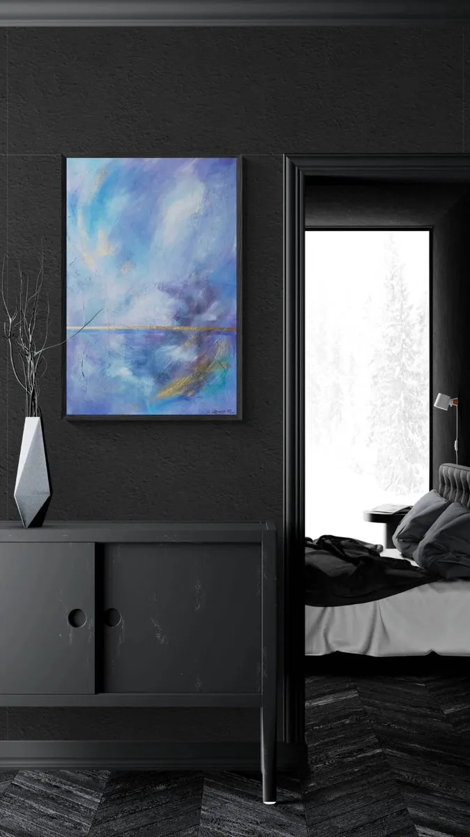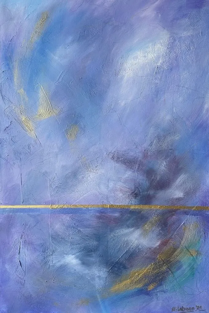 “Uyayi,” meaning Lullaby in Tagalog, is a captivating acrylic abstract painting that invites viewers into a serene, ethereal landscape where the sky and lake converge along a distant horizon. The artwork features a dynamic sky characterized by gentle movements and delicate wisps, evoking a sense of tranquility and dream-like quality. This celestial ballet is mirrored perfectly in the still waters of the lake below, enhancing the painting’s peaceful and reflective mood. The use of soothing colors and fluid brushstrokes reinforces the theme of a lullaby, making this piece a soothing visual symphony that calms and mesmerizes.