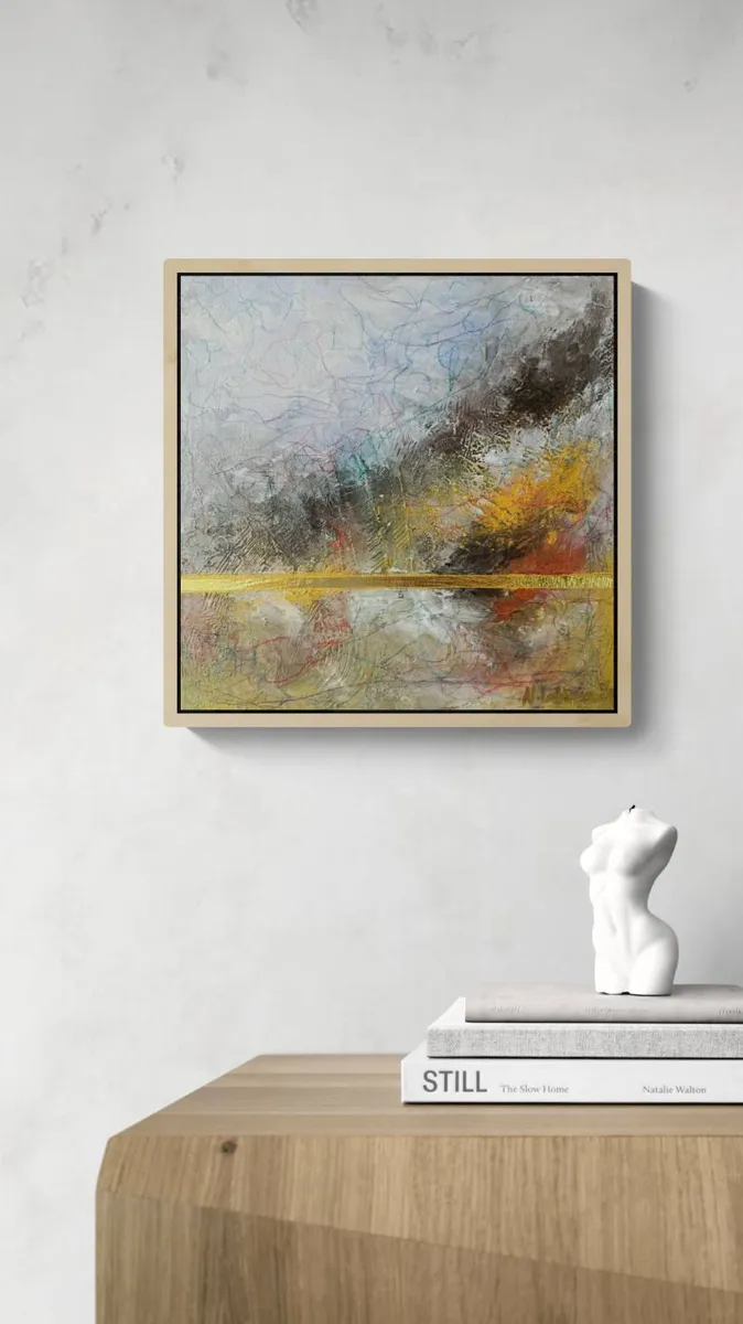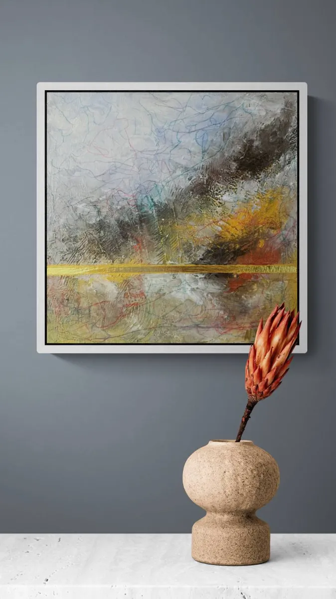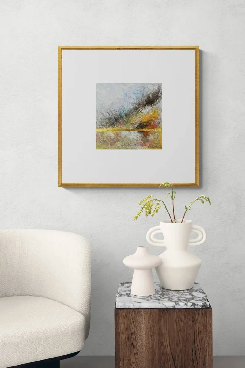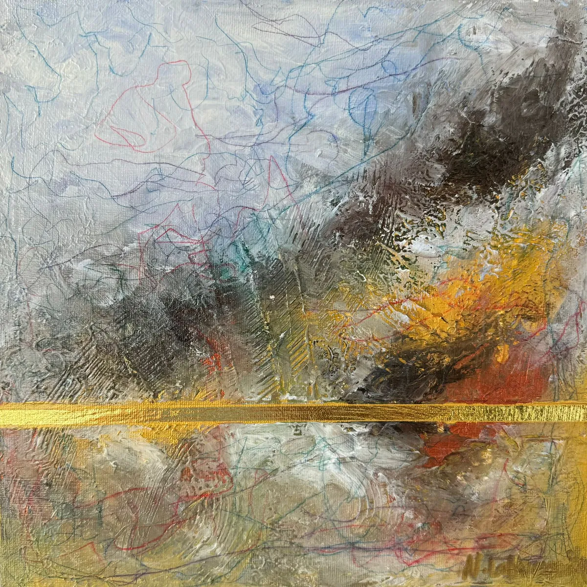 This evocative acrylic painting captures the tumultuous power of a storm overtaking a mountainous landscape. The textured surface of the canvas reveals the forceful interplay of wind and rain, conveyed through a dramatic mix of muted grays, earthy browns, and fiery yellows. The storm’s chaos is heightened by expressive lines that swirl across the piece, symbolizing the unpredictable nature of the elements. The signature gold line, running horizontally across the lower third, provides a striking contrast. Its radiant presence cuts through the turmoil, serving as a symbol of resilience and balance amidst the storm’s fury. This element of stability offers a visual anchor, grounding the viewer in the face of nature’s overwhelming power. The painting combines abstract and impressionistic elements, inviting the observer to feel the raw intensity of the scene while interpreting the emotional undercurrents beneath the storm. It’s a testament to the enduring strength found within chaos.