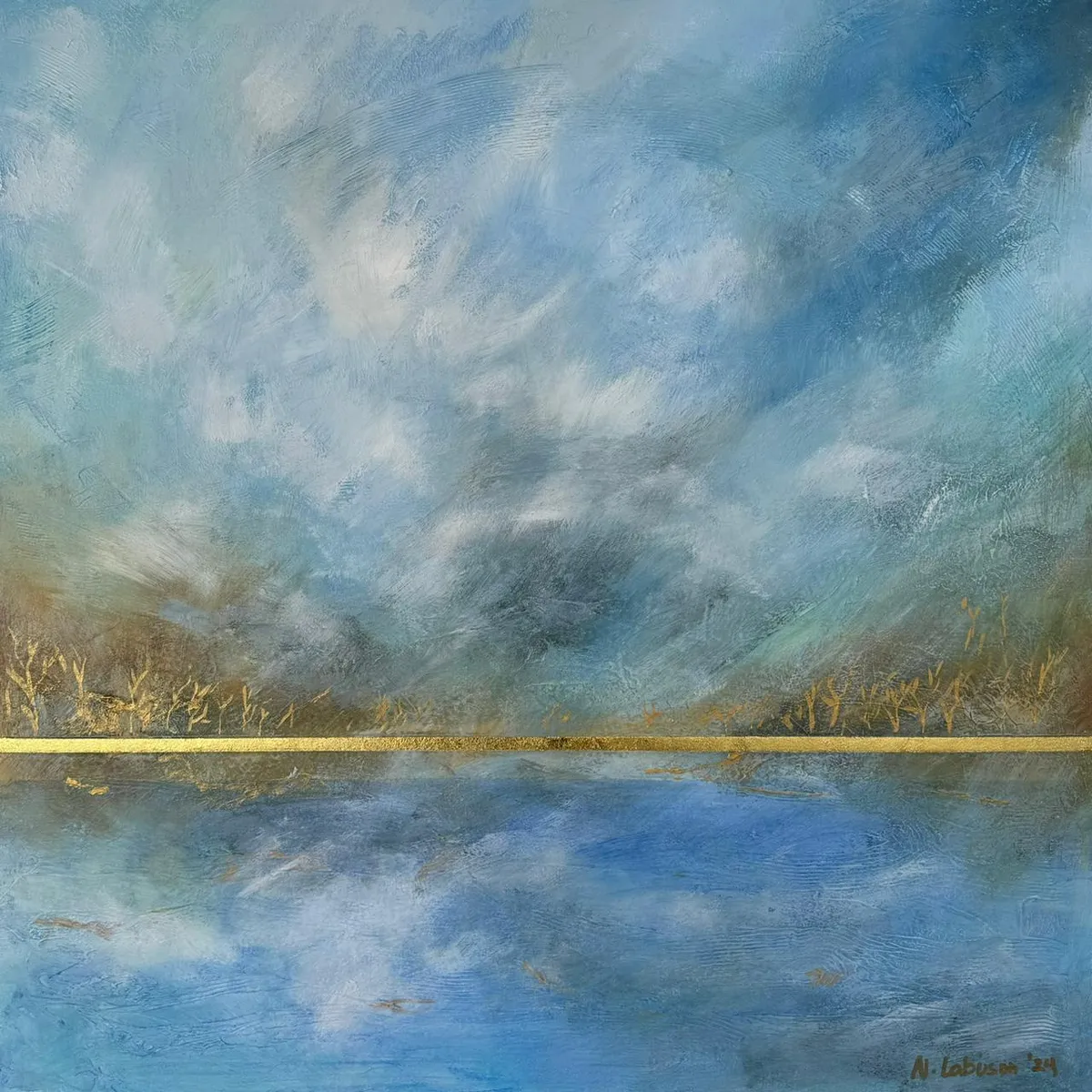 Veil of Resilience captures the quiet strength that emerges in moments of doubt and vulnerability. This abstract landscape, textured with delicate layers of acrylic, reflects the ethereal beauty found in both struggle and hope. Soft shades of sky blues and earthy golds drift across the canvas, creating a sense of vastness and introspection. A golden line, almost like a horizon, cuts through the center — a symbol of light piercing through uncertainty, guiding us forward. Inspired by the resilience seen in a friend, Veil of Resilience reminds us that even in the most challenging times, there’s a spark of hope waiting to be kindled. This piece encourages viewers to look beyond the veils of doubt and see the promise of renewal that lies ahead. Whether in solitude or in quiet reflection, Veil of Resilience holds space for both vulnerability and strength.