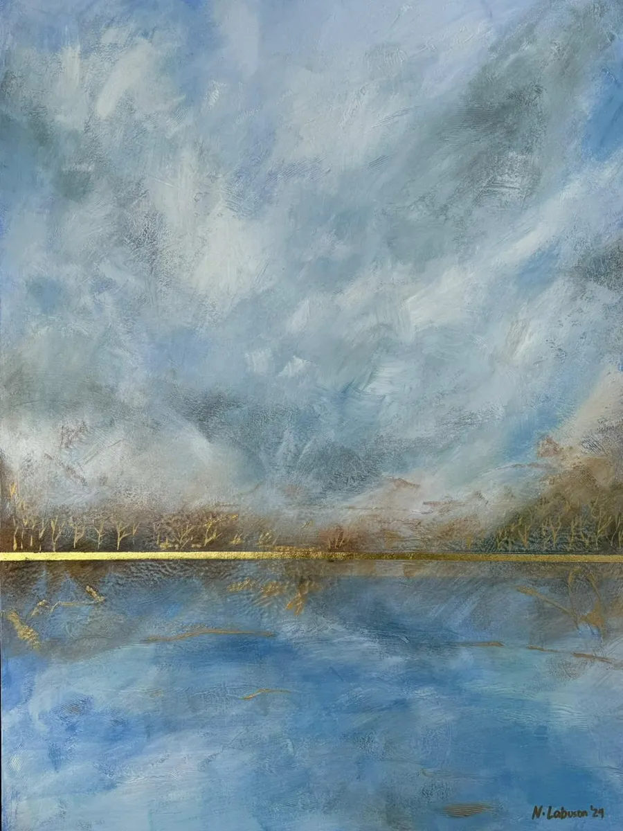 Veil of Resilience captures the quiet strength that emerges in moments of doubt and vulnerability. This abstract landscape, textured with delicate layers of acrylic, reflects the ethereal beauty found in both struggle and hope. Soft shades of sky blues and earthy golds drift across the canvas, creating a sense of vastness and introspection. A golden line, almost like a horizon, cuts through the center — a symbol of light piercing through uncertainty, guiding us forward. Inspired by the resilience seen in a friend, Veil of Resilience reminds us that even in the most challenging times, there’s a spark of hope waiting to be kindled. This piece encourages viewers to look beyond the veils of doubt and see the promise of renewal that lies ahead. Whether in solitude or in quiet reflection, Veil of Resilience holds space for both vulnerability and strength.