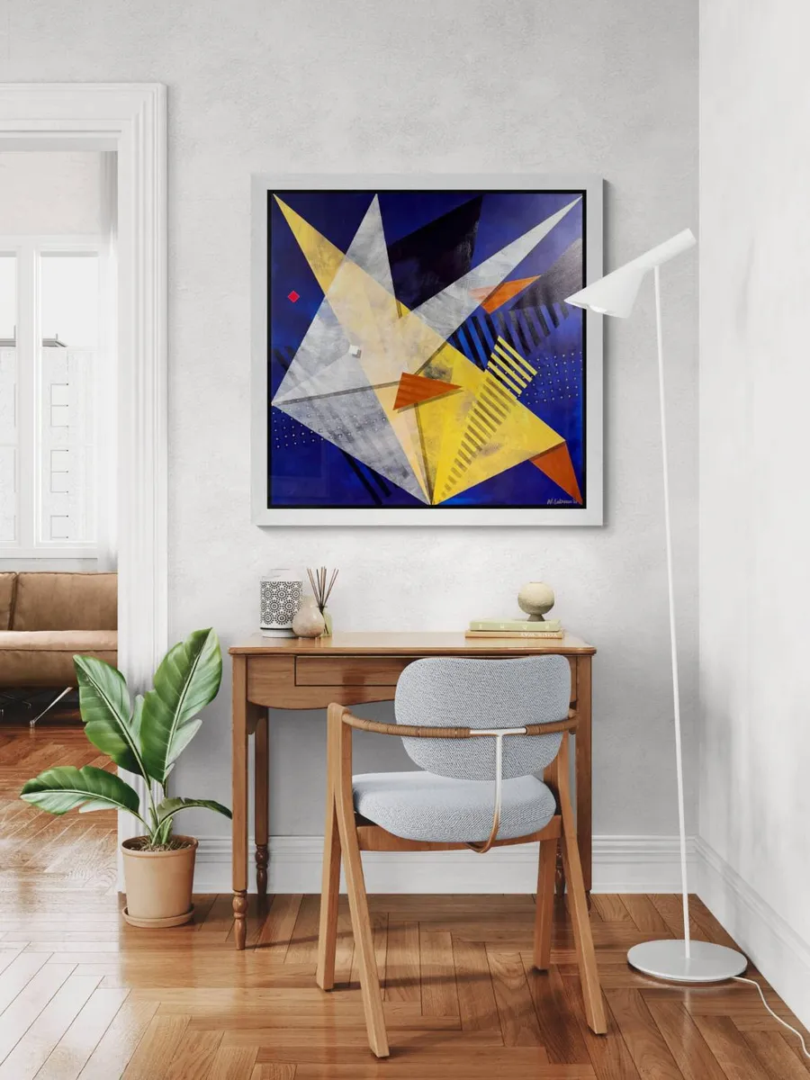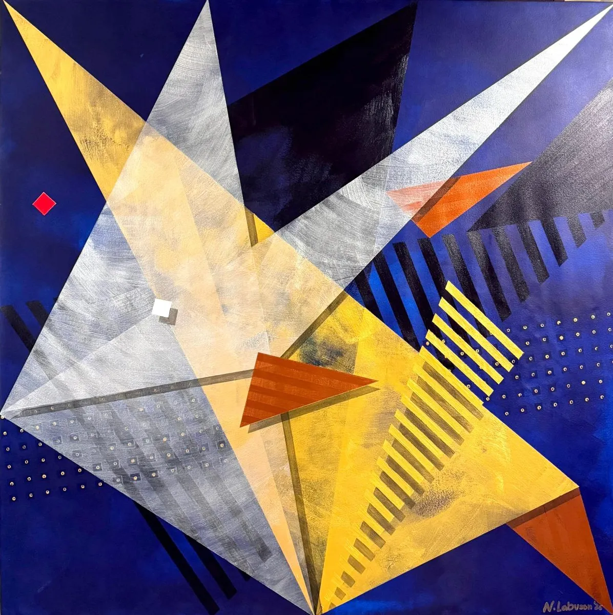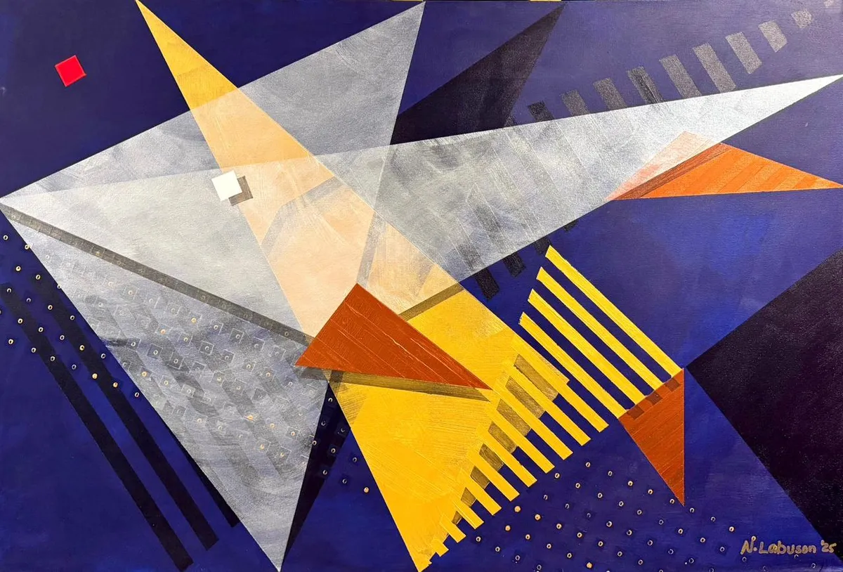 Rooted in the rich cultural and spiritual heritage of Taguig, Milagrosong Sta. Anang Banak is an abstract tribute to a local miracle passed down through generations — the divine intercession of Sta. Ana and the miraculous abundance of banak (mullet fish) during a time of famine. According to legend, in the late 16th century, the people of Sta. Ana, Taguig suffered through devastating hunger and hardship. In their desperation, they turned to Sta. Ana, mother of the Blessed Virgin, for help. In answer to their prayers, the once-empty river filled with banak, nourishing an entire community and renewing their faith. This moment of divine grace has since been commemorated every July 26 with the Sta. Anang Banak Festival, a vibrant celebration of life, water, and shared hope. In this three-piece series, I reimagine the miracle not through figuration but through movement, energy, and spiritual geometry. Painted with acrylic, each piece is layered using heavy dry brushing to create texture and motion, while translucent glazing builds light, depth, and dimension. Angular forms pierce the canvas — symbolizing abundance, divine intervention, and the swift, glimmering presence of banak swimming through sacred waters. The dominant hues of midnight blue and gold evoke the mystical river at twilight — a time between the seen and the unseen, when miracles unfold. Embedded shapes — red and white squares, cascading lines, and golden dots — represent the tension between divine structure and the chaos of human need. This series is both a devotional homage to my hometown’s enduring faith and a visual meditation on how memory, myth, and miracle ripple through the soul of a place. Milagrosong Sta. Anang Banak is not just about fish — it’s about grace that arrives when we need it most.