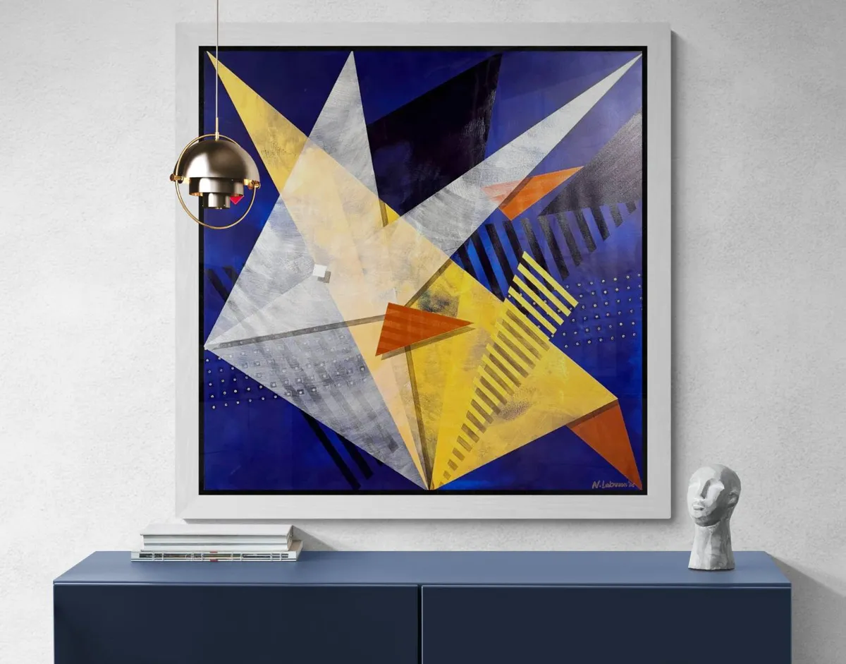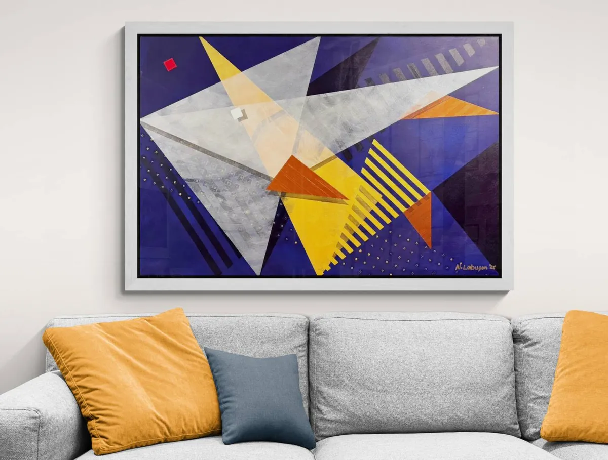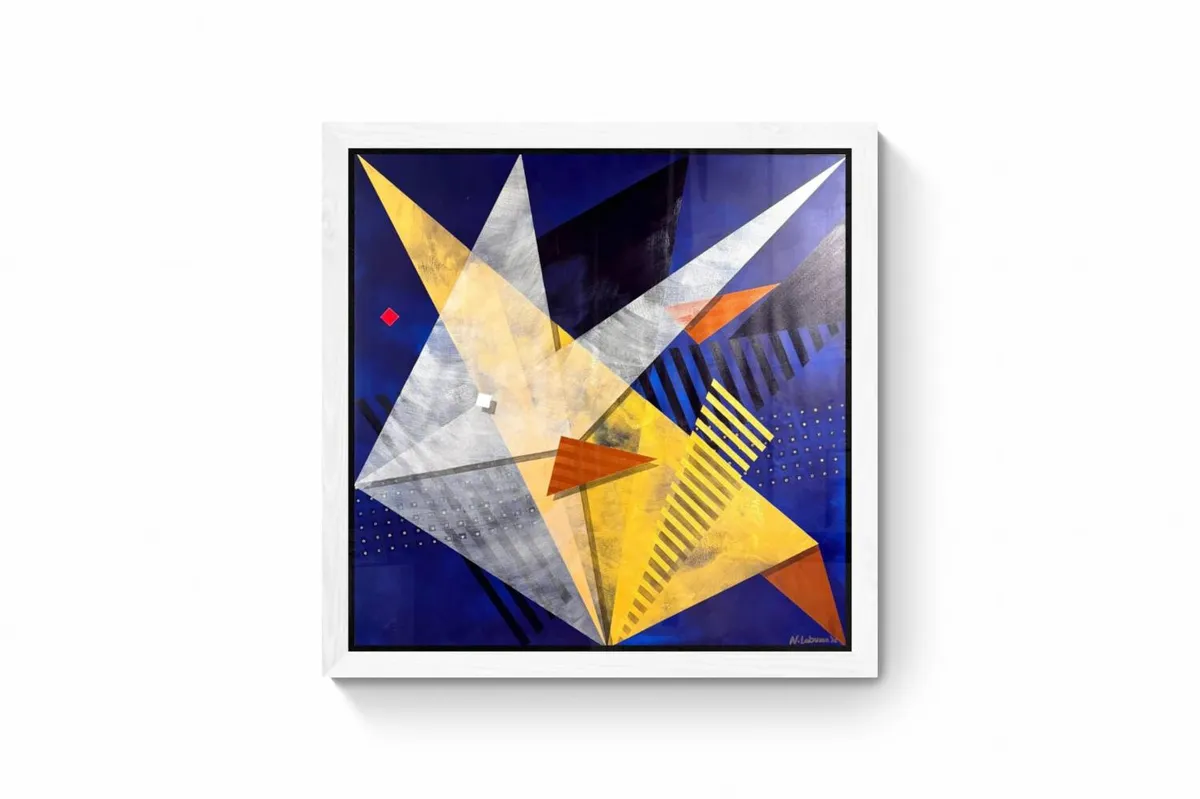 Rooted in the rich cultural and spiritual heritage of Taguig, Milagrosong Sta. Anang Banak is an abstract tribute to a local miracle passed down through generations — the divine intercession of Sta. Ana and the miraculous abundance of banak (mullet fish) during a time of famine. According to legend, in the late 16th century, the people of Sta. Ana, Taguig suffered through devastating hunger and hardship. In their desperation, they turned to Sta. Ana, mother of the Blessed Virgin, for help. In answer to their prayers, the once-empty river filled with banak, nourishing an entire community and renewing their faith. This moment of divine grace has since been commemorated every July 26 with the Sta. Anang Banak Festival, a vibrant celebration of life, water, and shared hope. In this three-piece series, I reimagine the miracle not through figuration but through movement, energy, and spiritual geometry. Painted with acrylic, each piece is layered using heavy dry brushing to create texture and motion, while translucent glazing builds light, depth, and dimension. Angular forms pierce the canvas — symbolizing abundance, divine intervention, and the swift, glimmering presence of banak swimming through sacred waters. The dominant hues of midnight blue and gold evoke the mystical river at twilight — a time between the seen and the unseen, when miracles unfold. Embedded shapes — red and white squares, cascading lines, and golden dots — represent the tension between divine structure and the chaos of human need. This series is both a devotional homage to my hometown’s enduring faith and a visual meditation on how memory, myth, and miracle ripple through the soul of a place. Milagrosong Sta. Anang Banak is not just about fish — it’s about grace that arrives when we need it most.
