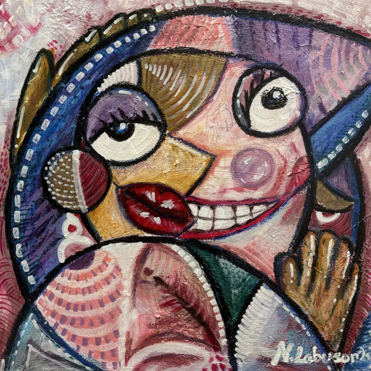 In Maritess, the artist transforms a familiar cultural archetype into a bold, unsettling, and playful visual narrative. The title borrows from local vernacular—Maritess, a name synonymous with gossip, unsolicited commentary, and the ever-watchful eye of the neighborhood. Yet rather than portraying gossip as merely trivial, the work exposes its deeper textures: curiosity, performance, intrusion, and survival. The figure’s exaggerated facial features—wide, uneven eyes, an overstretched grin, and flushed cheeks—suggest a character caught between delight and discomfort. There is humor here, but it is edged with unease. One eye observes, the other judges; the smile charms while simultaneously revealing its teeth. This duality mirrors the nature of gossip itself: friendly on the surface, invasive underneath. Layered acrylic forms provide structure and weight, while pastel marks soften and disrupt, creating tension between control and spontaneity. Patterns, dots, and repeated gestures echo murmurs passed from ear to ear, while the heavy black outlines act as boundaries—attempts to contain something that inevitably spills. The hand raised beside the face becomes a symbol of secrecy and complicity, the universal gesture of “may sinasabi ako.” Color plays a crucial role in the work’s emotional impact. Warm reds and pinks suggest intimacy and familiarity, while cooler blues and purples introduce distance and judgment. The surface is richly worked, almost restless, reinforcing the idea that Maritess is never still—always watching, always listening, always ready. More than a caricature, Maritess is a reflection. It asks the viewer to confront their own participation in stories told about others, the pleasure of knowing, and the cost of being known. At once humorous and biting, the piece holds up a mirror and dares us to smile back.