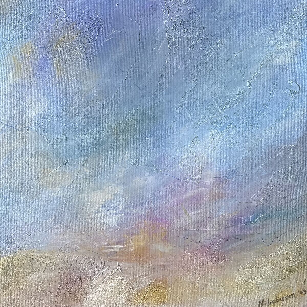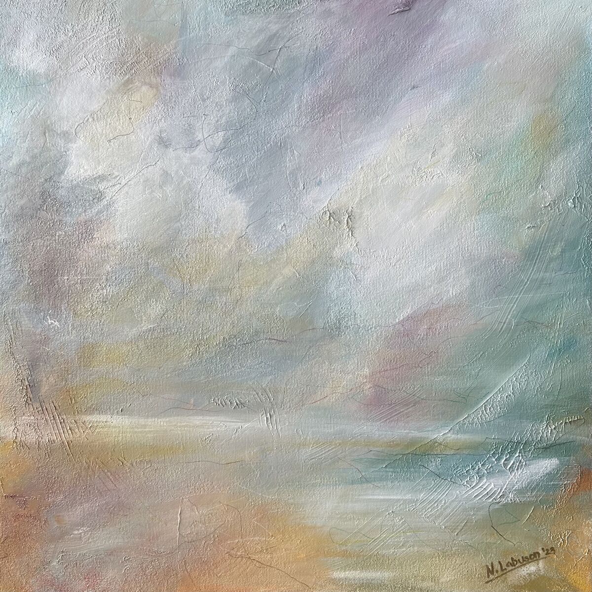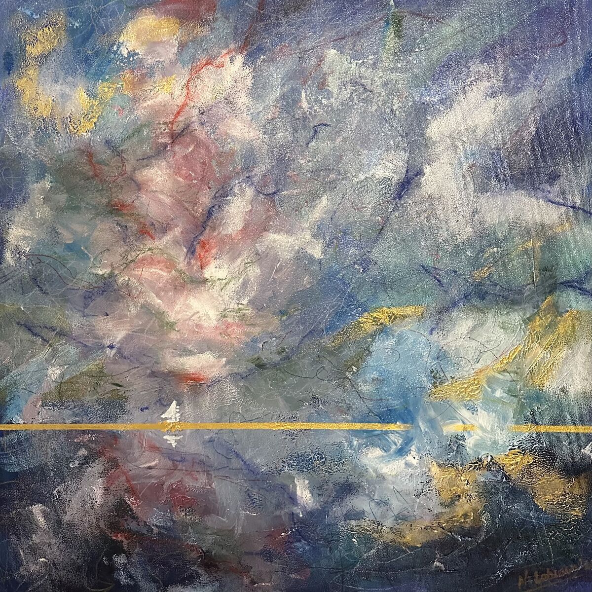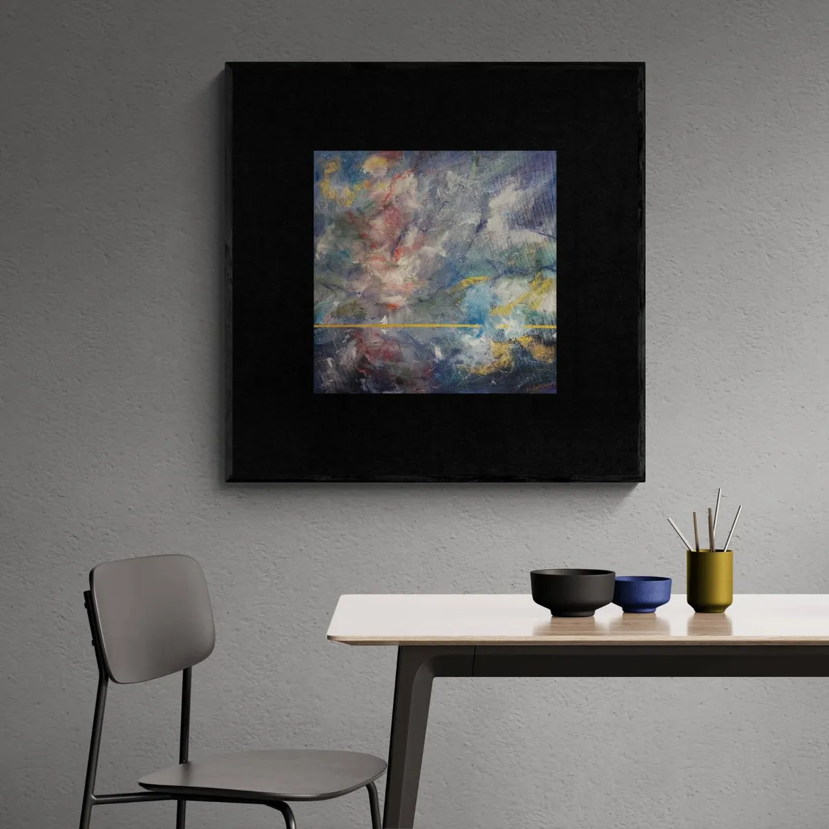 "Storm’s Edge" stands as a vivid embodiment of the delicate moment just before nature asserts its formidable power. With a palette rich in blue, yellow ocher, ethereal whisps of viridian, and assertive touches of crimson, the artist intricately weaves a tale of anticipation and profound respect for the natural world. The textured acrylic strokes provide depth and dimension, creating an atmospheric tension that is palpable. It's a work where tranquility and turmoil coalesce, where each color and brushstroke invites viewers on a sensory journey, echoing the romantic fervor of bygone eras while firmly rooted in a contemporary narrative. This piece was part of
