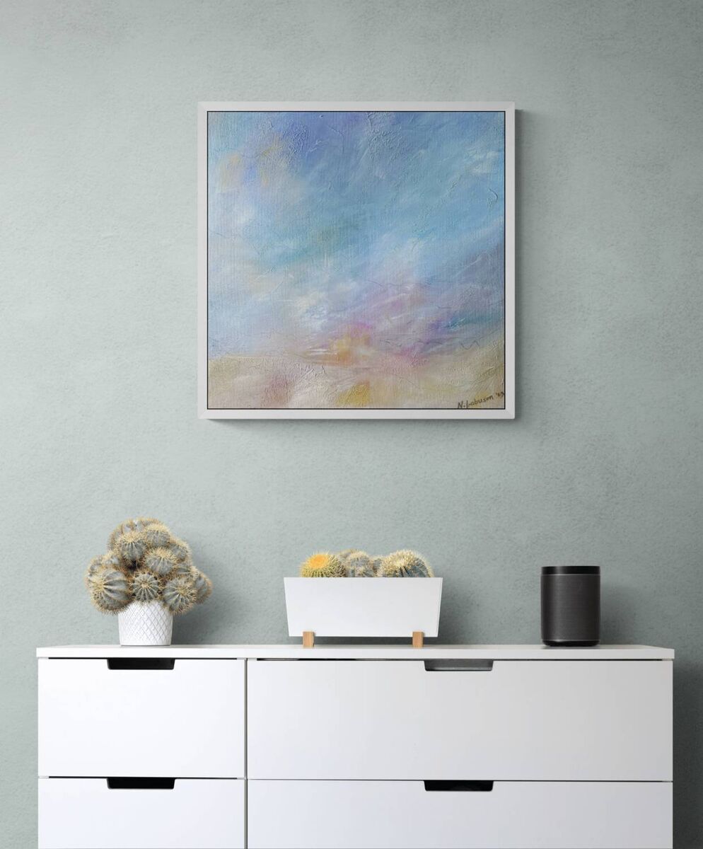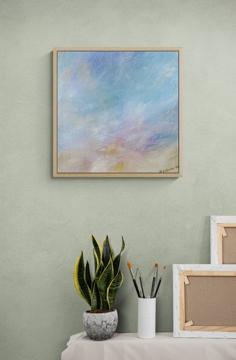 "Evocatively titled 'Amanecer,' this striking piece of abstract art employs a refined selection of soft blues, warm yellow ochre, and smoky hints of crimson to articulate a profound sensory experience. Resembling the first moments of dawn, the artwork invites viewers into a serene, meditative space where the breaking day is just beginning to shed its light. The nuanced blend of colors presents a vivid display of dawn's tranquility, mingling with the energy of the nascent day. The soft blues offer a calming atmosphere reminiscent of a clear morning sky, while the yellow ochre embodies the gentle warmth of the rising sun. Flecks of crimson interspersed throughout the piece add depth, hinting at the inevitable intensity of the day ahead. In 'Amanecer', texture becomes a narrative element, contributing to the artwork's evocative aesthetic. The artist has expertly manipulated acrylic paints to create an engaging multi-dimensional surface that adds tangible depth to the visual narrative. It beckons observers to not just see, but to touch, inviting them to explore the landscape of dawn with their fingertips. This painting is a symphony of color and texture that encapsulates the profound quiet and gradual invigoration of dawn — Amanecer. Every glance reveals a new layer, making it an enduring source of contemplation and wonder."