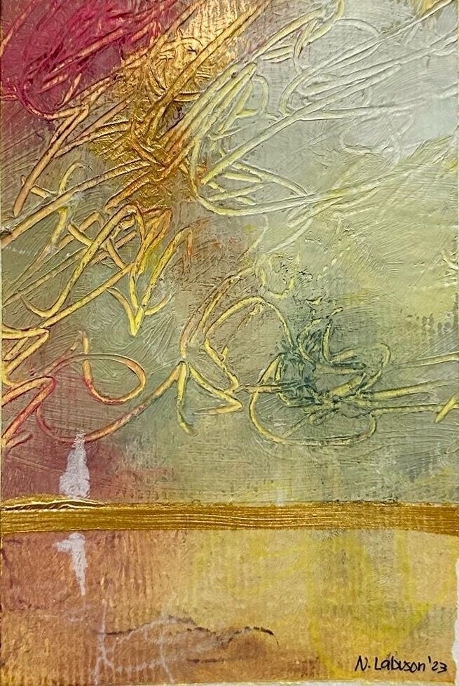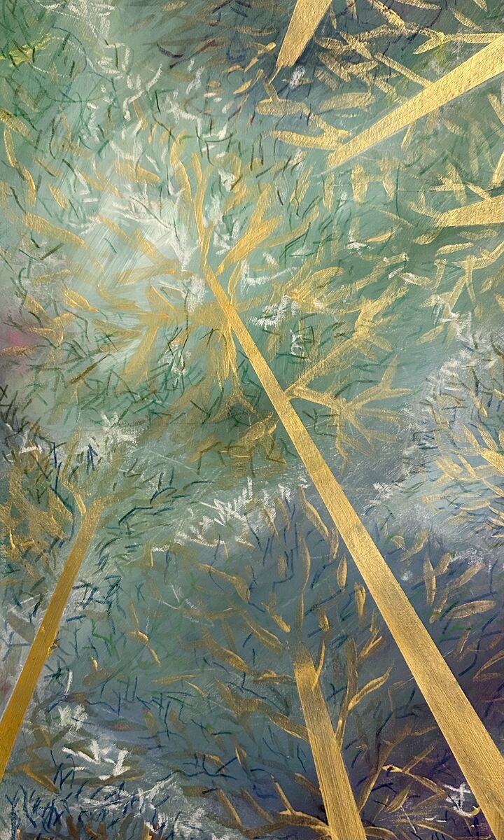 "Look Up" is a transcendent mixed media artwork using acrylic and pastel on a wood grain-like textured canvas, encapsulating a serene yet profound dialogue between the observer and the natural world. The abstract representation draws inspiration from the view within a forest, guiding eyes upwards through a sylvan canopy towards the sky. Central to the piece is the "shy crown" phenomenon, artfully illustrated with a palette rich in greens, blues, and gold, symbolizing growth, tranquility, and enlightenment respectively. These colors blend seamlessly, creating a captivating depiction of light filtering through the branches, evoking a sense of wonder and introspection. Through its color harmony and lyrical abstraction, "Look Up" emerges as a reflective ode to the natural world, urging viewers to explore the nurturing ethos inherent in the co-existence amidst the wilderness.