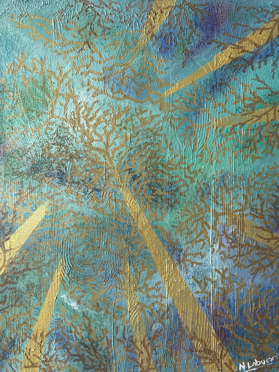 "Look Up" is a transcendent mixed media artwork using acrylic and pastel on a wood grain-like textured canvas, encapsulating a serene yet profound dialogue between the observer and the natural world. The abstract representation draws inspiration from the view within a forest, guiding eyes upwards through a sylvan canopy towards the sky. Central to the piece is the "shy crown" phenomenon, artfully illustrated with a palette rich in greens, blues, and gold, symbolizing growth, tranquility, and enlightenment respectively. These colors blend seamlessly, creating a captivating depiction of light filtering through the branches, evoking a sense of wonder and introspection. Through its color harmony and lyrical abstraction, "Look Up" emerges as a reflective ode to the natural world, urging viewers to explore the nurturing ethos inherent in the co-existence amidst the wilderness.
