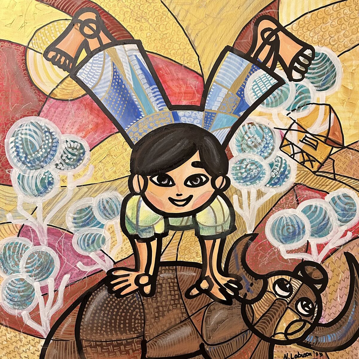 Navidad a Través del Mar I" is a poignant and abstract tribute to the Overseas Filipino Workers (OFWs), honoring their sacrifices and resilience. This evocative painting captures the essence of a lone figure, symbolizing an OFW, carrying a traditional Filipino parol - a star-shaped Christmas lantern. The composition is infused with vibrant colors and dynamic brush strokes, representing the cultural richness and festive spirit of the Philippines. The figure is positioned against a backdrop that artistically suggests a foreign land, illustrating the physical distance from their homeland. This piece poignantly reflects the emotional journey of these workers, torn between their dedication to providing for their families and the longing for their home.